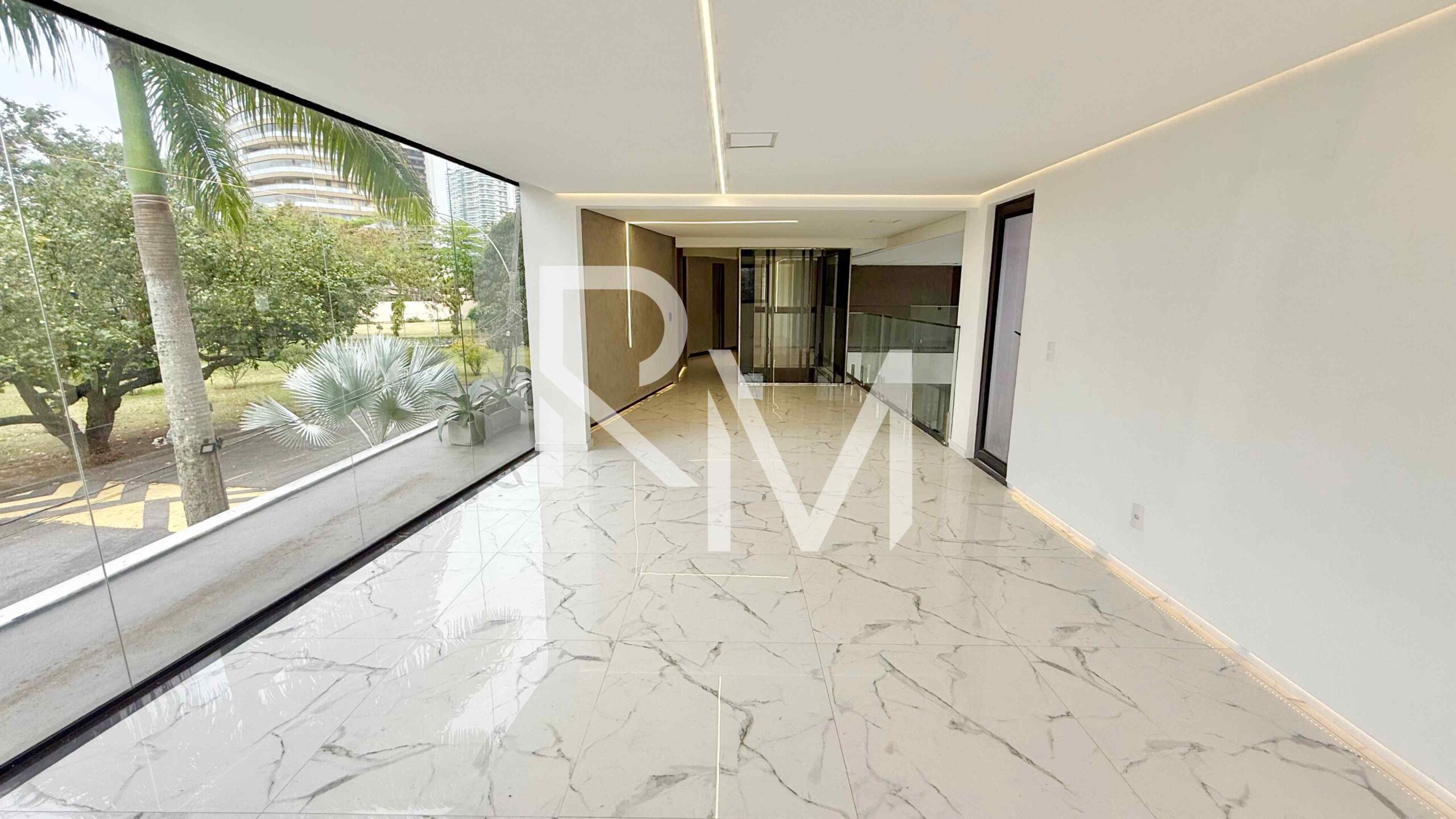 No primeiro pavimento, o hall de entrada dá acesso a um amplo living com múltiplos ambientes, marcado por excelente iluminação natural e um imponente pé-direito duplo. O espaço conta ainda com suíte térrea, lavabo assinado pelo renomado arquiteto Ruy Ohtake, cinema privativo com tratamento acústico e equipamento de alta performance, adega com capacidade para 750 garrafas e lounge com copa de apoio. A área social se completa com sala de jantar e uma ampla copa-cozinha equipada, além de lavanderia e dependência completa.
