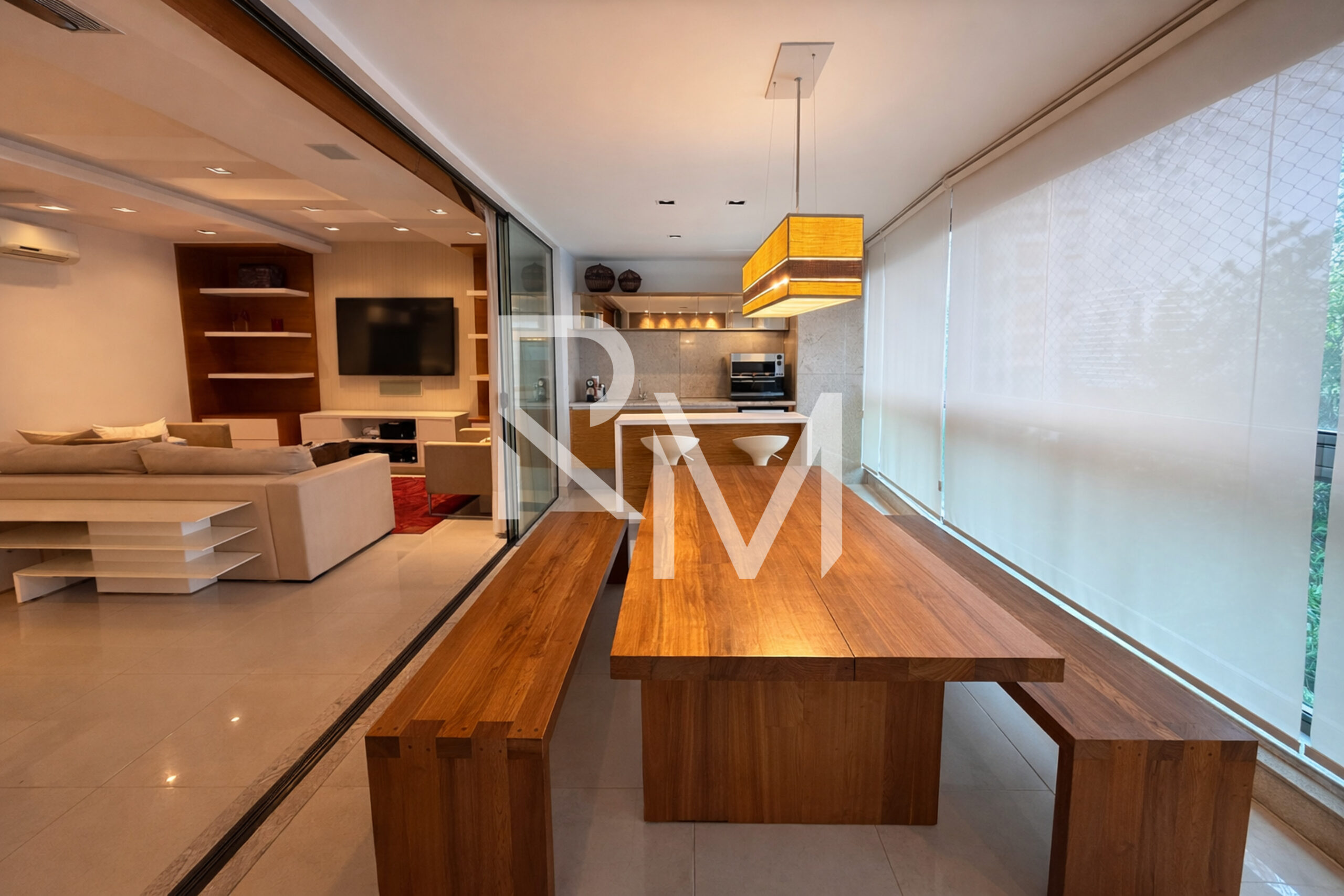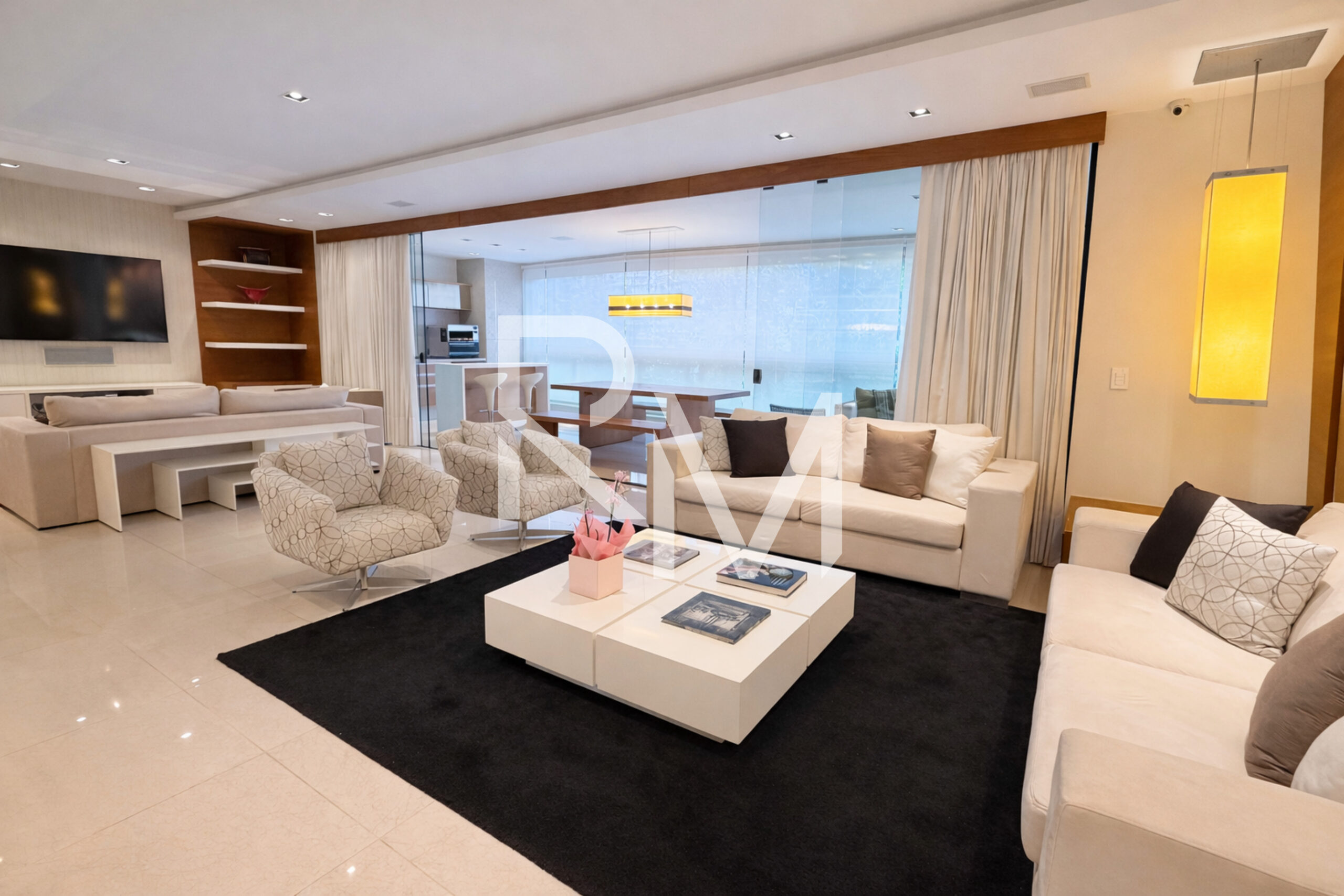 Originalmente com quatro suítes, o projeto foi cuidadosamente adaptado para três suítes, ampliando a suíte master, com fácil possibilidade de reversão. A área social impressiona com uma ampla sala distribuída em três ambientes, equipada com projeto de iluminação e som, integrada à varanda fechada com cortina de vidro, que abriga um elegante espaço gourmet com churrasqueira.